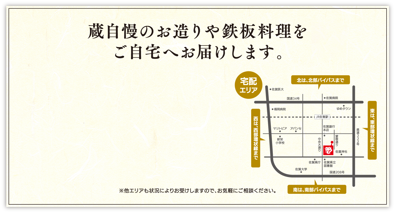 私たちは仲買人として、昭和20年より佐賀市内を中心に限りなく100%に近い満足をお届けするべく、 日々精進して参りました。魚によって異なる鮮度と性質を熟知し、良い魚をより美味しく召し上がって頂くため、 間違いのない魚を選ぶ“目”には自信を持っています。その仲買人ならではの目利きと仕入れ力を生かし、 一人でも多くの人に安くて美味しいものを味わっていただきたいという想いから「産地直送 仲買人直営店 蔵 -KURA- 」は始まりました。 佐賀の自然が育んだ恵みは、豊富な栄養と深い味わいに富み、世界に誇るべき素晴らしいものだと自負しております。 魚貝類はもちろん、お肉やお野菜も責任をもって選びぬいた自慢の食材たち。安心安全で美味しい佐賀の味を心ゆくまでご賞味くださいませ。